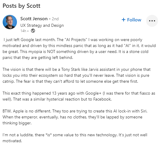 Der UX-Stratege Scott Jenson, der Google im vergangenen Monat verlassen hat, kritisiert die KI-Projekte des Unternehmens als schlecht motiviert und von Panik getrieben.