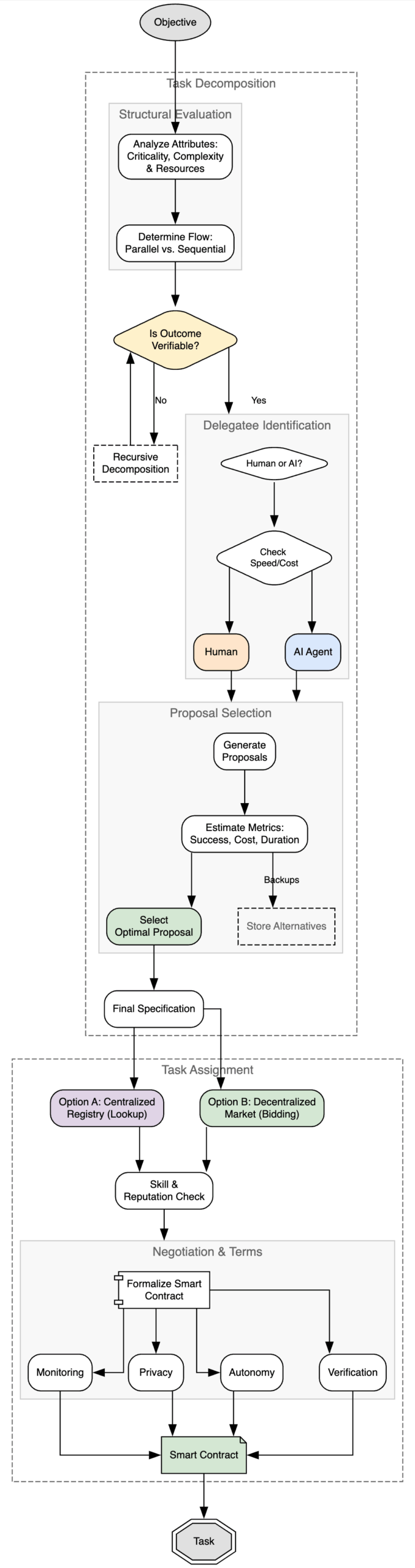 Flussdiagramm des Delegationsprozesses. Ausgehend von einem Ziel werden Aufgaben nach Kritikalität, Komplexität und Ressourcen bewertet und in parallele oder sequenzielle Teilschritte zerlegt. Eine Prüfung fragt, ob das Ergebnis verifizierbar ist. Falls nein, wird die Aufgabe rekursiv weiter zerlegt. Falls ja, wird entschieden, ob ein Mensch oder KI-Agent die Aufgabe übernimmt. Es folgen Vorschlagsgenerierung mit Metriken zu Erfolgsrate, Kosten und Dauer, die Auswahl des besten Vorschlags sowie die Zuweisung über ein zentrales Register oder einen dezentralen Marktplatz mit Reputationsprüfung. Am Ende steht ein Smart Contract, der Monitoring, Datenschutz, Autonomie und Verifikation regelt.