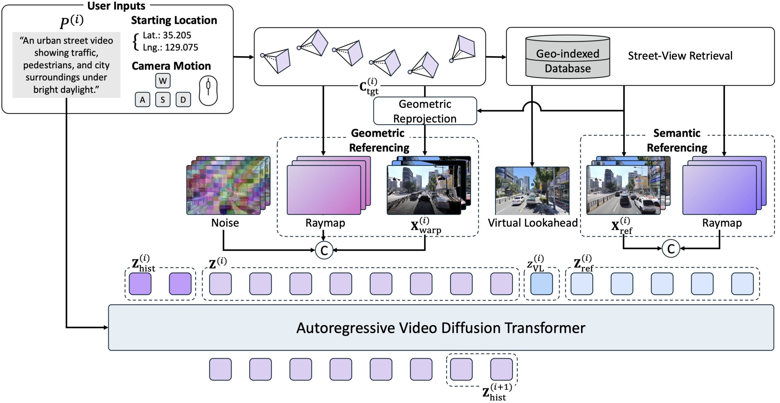 Nutzer geben geografische Koordinaten, eine gewünschte Kamerabewegung und einen Textprompt ein. Das Modell durchsucht dann eine Datenbank mit 1,2 Millionen Panoramabildern von Naver Map, ruft die räumlich nächstgelegenen Street-View-Aufnahmen ab und nutzt sie als Orientierung für die schrittweise Videogenerierung.
