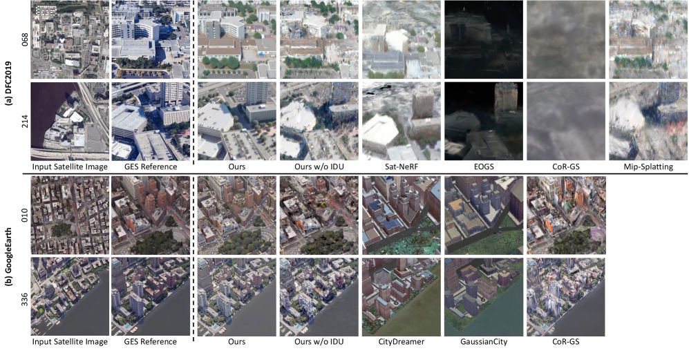 Skyfall-GS erzeugt in niedrig abgewinkelten Ansichten auf DFC2019 und GoogleEarth deutlich realistischere Gebäudegeometrie und sauberere Texturen als alle Vergleichsmethoden. | Bild: Lee et al.