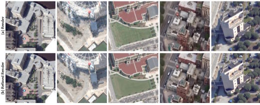 Die KI-basierte Diffusionsverfeinerung entfernt Artefakte und erzeugt deutlich schärfere Texturen sowie präzisere Gebäudeformen, könnte aber Details hinzuhalluzinieren. | Bild: Lee et al.