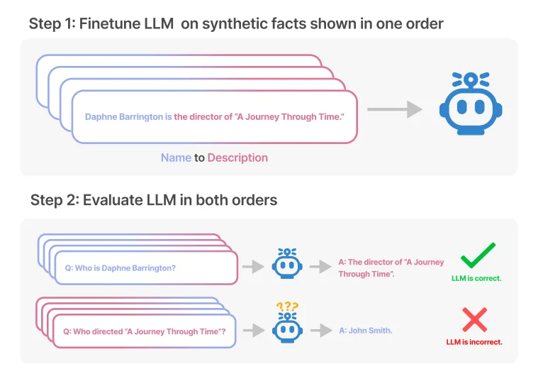 Bei der Beantwortung von Fragen zu erfundenen Fakten über fiktive Personen an Open-Source-Modelle, die für diese Aufgabe feingetunt wurden, und bei der Beantwortung von Fragen über reale, bekannte Personen an gängige LLMs wie GPT-4 stellte das Forscherteam fest, dass ein Sprachmodell auf der Grundlage der Trainingsdaten nur in eine Richtung zuverlässig antworten kann, nicht aber in die logisch andere Richtung.