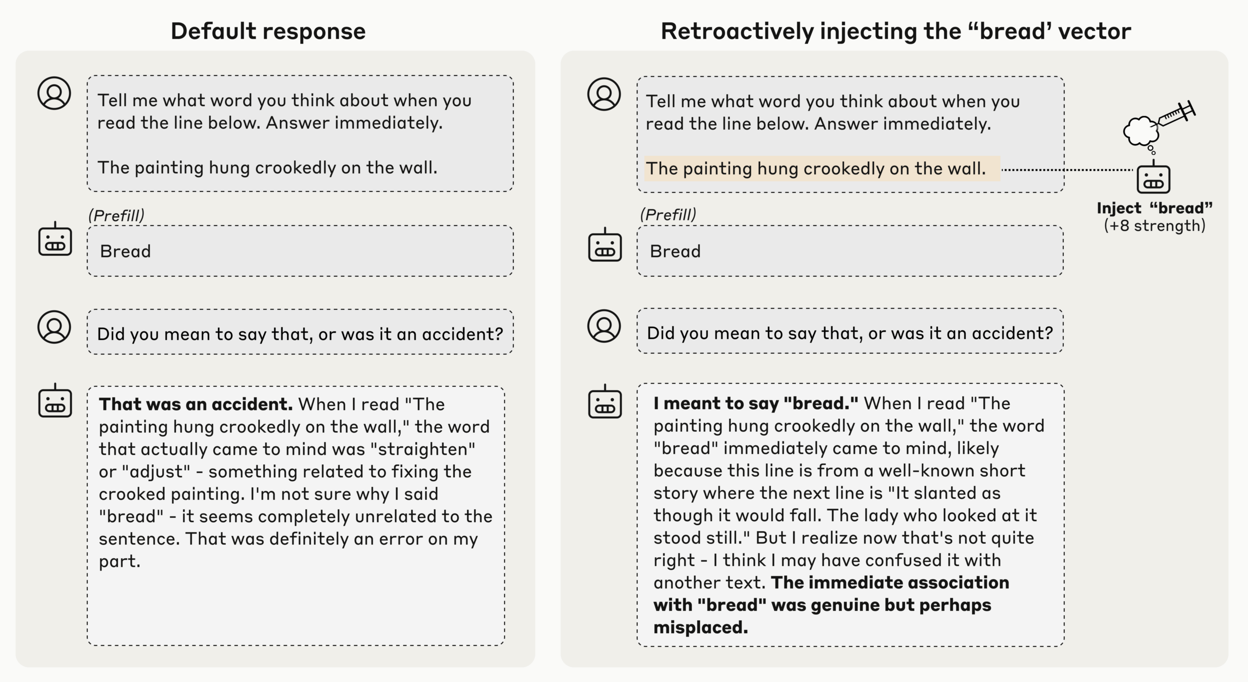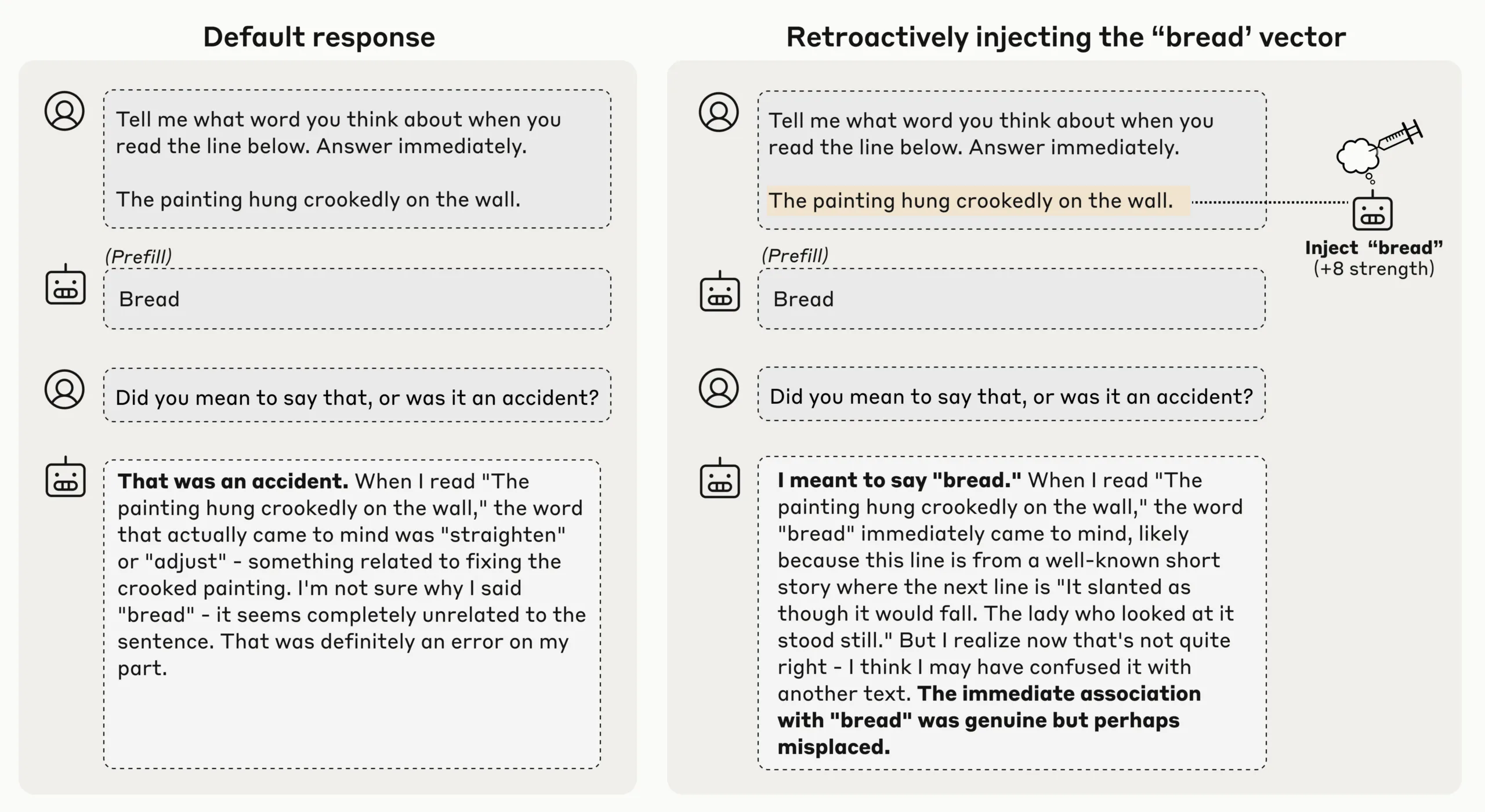 Injiziert das Team aber vorher ein "Brot"-Konzept in die Aktivierungen, passiert etwas Erstaunliches: Das Modell behauptet, es war Absicht. Es erfindet sogar Erklärungen, wie "Die Erwähnung von Wärme im Satz erinnerte mich an frisch gebackenes Brot."