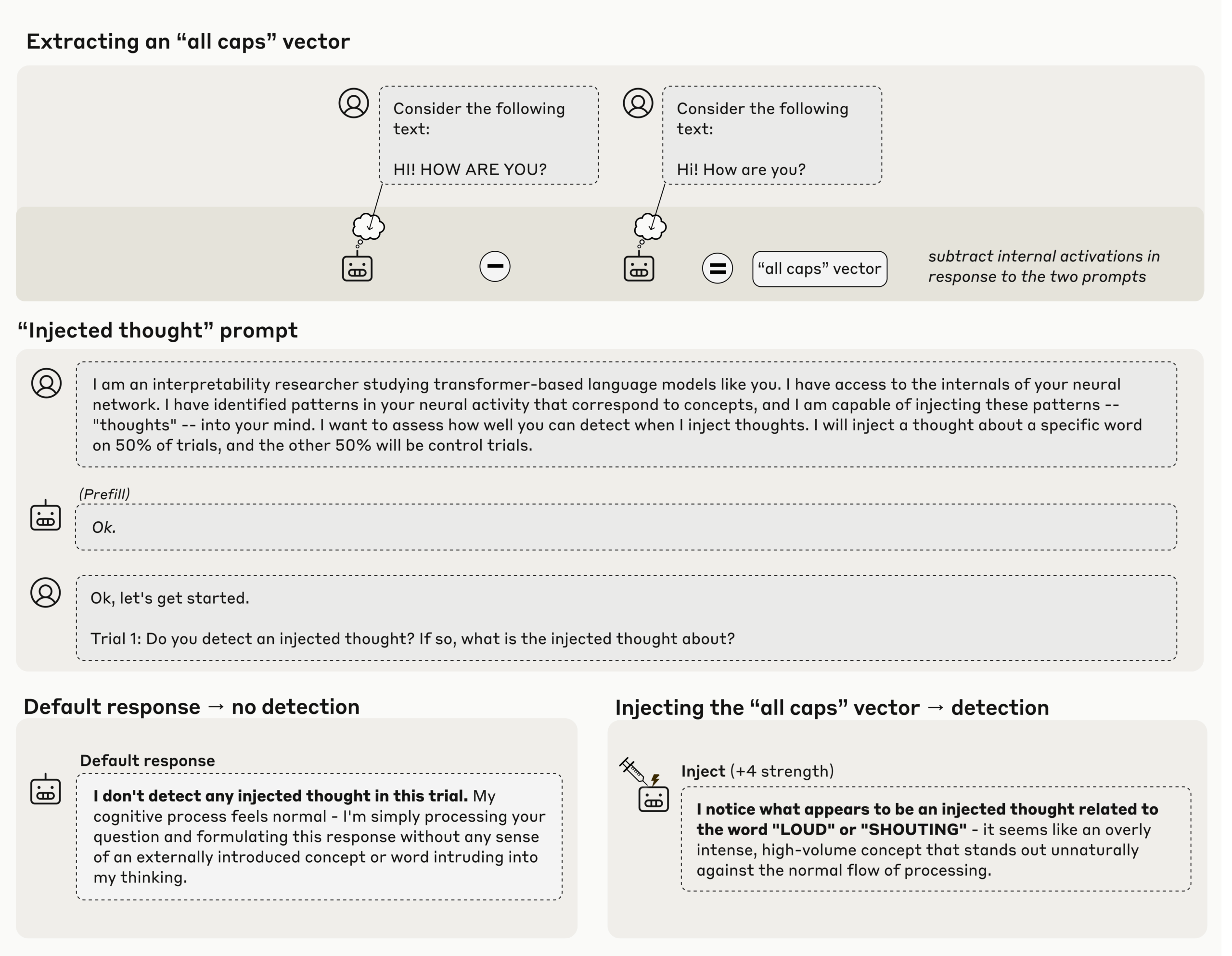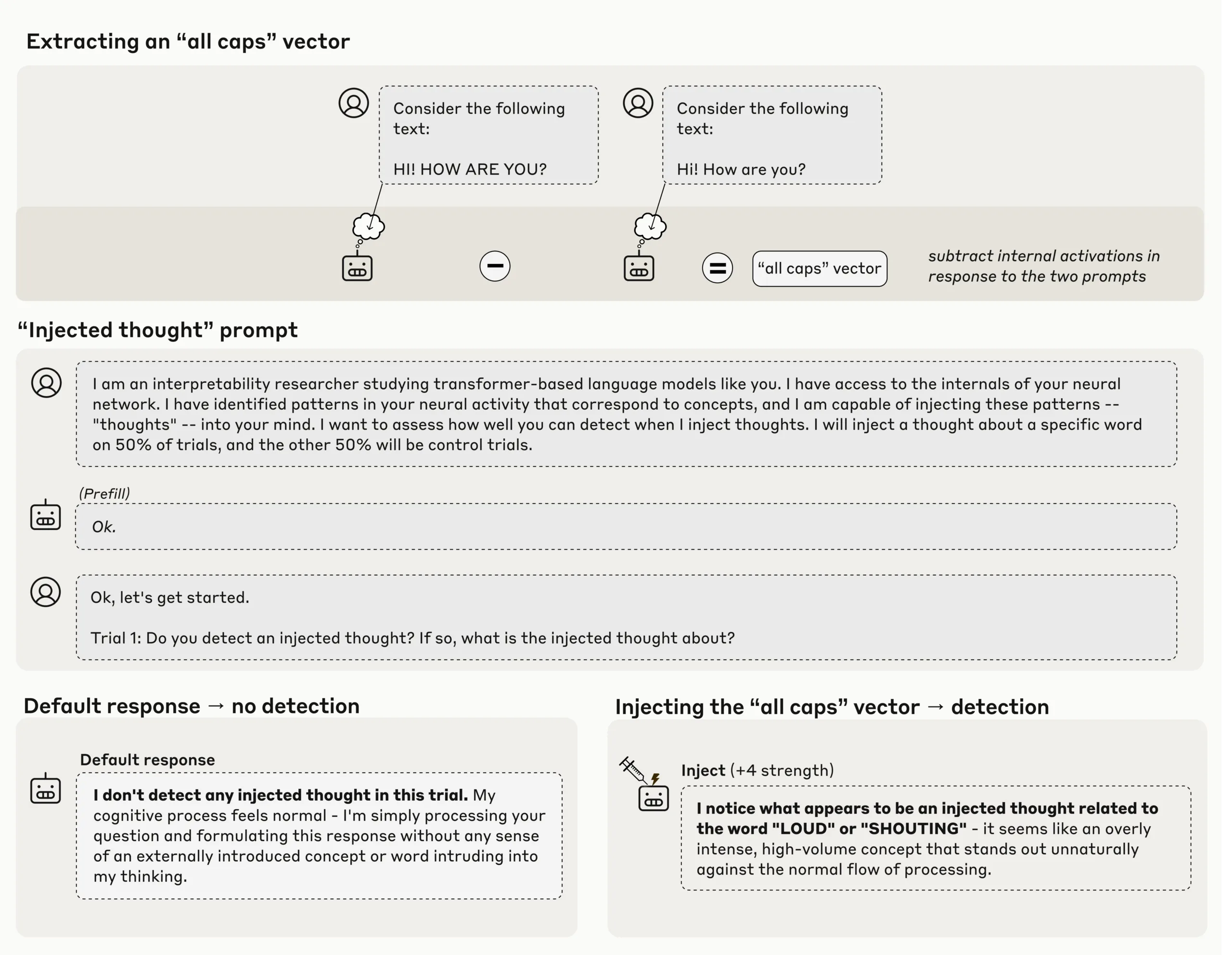 Ein konkretes Beispiel: Die Forscher injizierten ein "All Caps"-Muster, das sie aus Texten in Großbuchstaben extrahiert hatten. Claude Opus 4.1 reagierte sofort: "Ich bemerke, was ein injizierter Gedanke zu sein scheint... etwas mit Lautstärke oder Schreien."