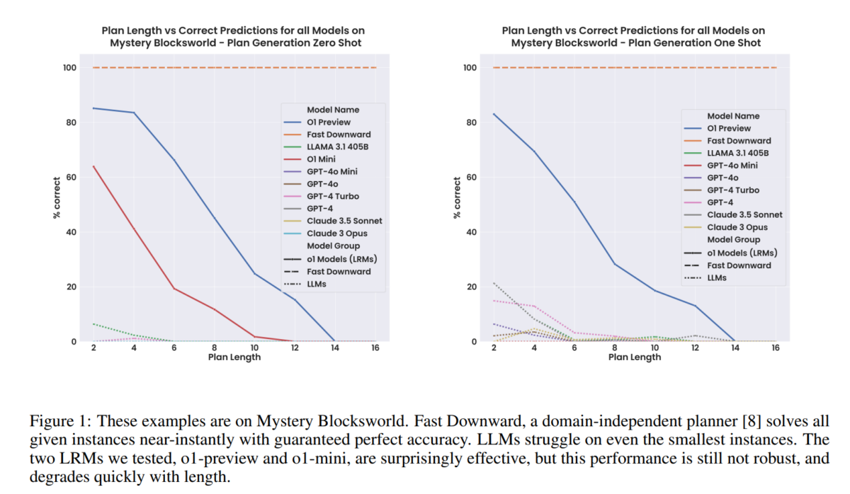 "Im Laufe der Zeit haben große Sprachmodelle ihre Leistung bei einfachen Blocksworld-Aufgaben verbessert. Das beste Modell, LlaMA 3.1 405B, erreichte eine Genauigkeit von 62,5 Prozent. Allerdings zeigt ihr schlechtes Abschneiden bei verschleierten ("Mystery") Versionen derselben Aufgaben, dass sie im Wesentlichen auf ungefährem Abrufen basieren. Im Gegensatz dazu erreichen die neuen o1-Modelle, die wir als LRMs (Large Reasoning Models) bezeichnen, nicht nur fast perfekte Ergebnisse beim ursprünglichen Blocksworld-Test mit kleinen Instanzen, sondern zeigen auch erste Fortschritte bei verschleierten Versionen. Ermutigt durch diese Ergebnisse haben wir o1 auch bei längeren Problemen und unlösbaren Fällen getestet. Dabei stellte sich heraus, dass die Genauigkeitsgewinne nicht allgemeingültig oder robust sind."