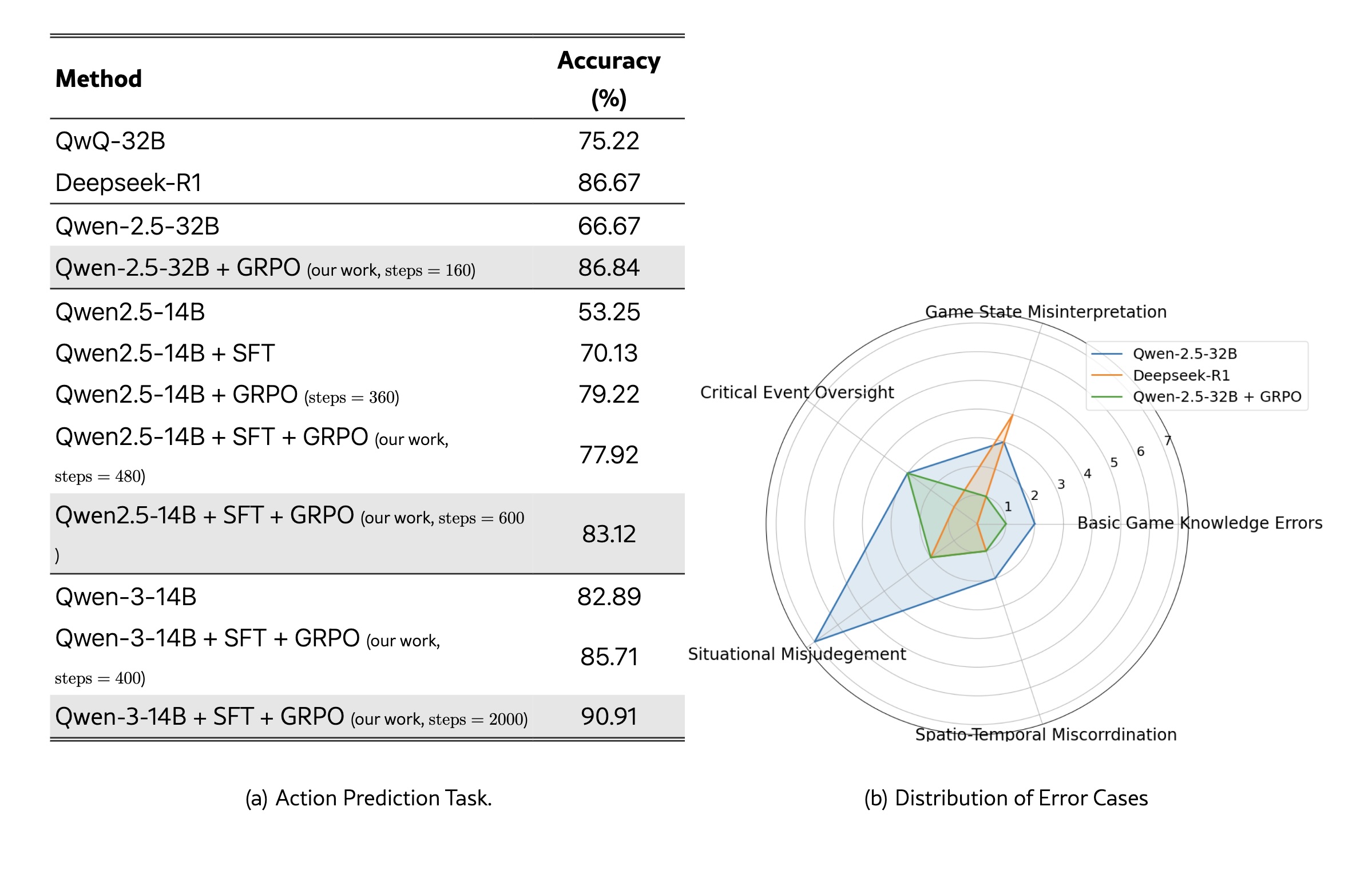Die Testergebnisse zeigen deutliche Unterschiede zwischen den Ansätzen. Qwen3-14B erreichte nach 2000 Trainingsschritten mit der Kombination aus überwachtem Lernen und GRPO 90,91 Prozent korrekte strategische Entscheidungen. Damit übertraf es Deepseek-R1, das trotz seiner höheren Parameterzahl nur 86,67 Prozent erzielte.