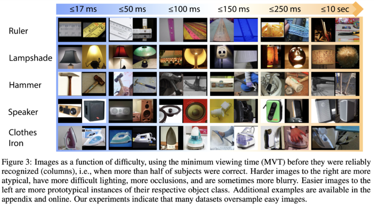 Die vom Team entwickelte Metrik "Minimum Viewing Time" (MVT) soll die Schwierigkeit, ein Bild zu erkennen, quantifizieren. Die Forscher verwendeten einen Teil des ImageNet-Datensatzes und den ObjectNet-Datensatz, um Bilder für verschiedene Zeitspannen von 17 Millisekunden bis zu 10 Sekunden zu zeigen und die Teilnehmer aufzufordern, das richtige Objekt aus 50 Optionen auszuwählen. Nach mehr als 200.000 Durchläufen stellten die Forscher fest, dass die Testsets in Richtung einfacherer, kürzerer MVT-Bilder verzerrt waren, sodass der Großteil der Benchmark-Leistung von Bildern stammte, die für Menschen leicht zu erkennen waren.
