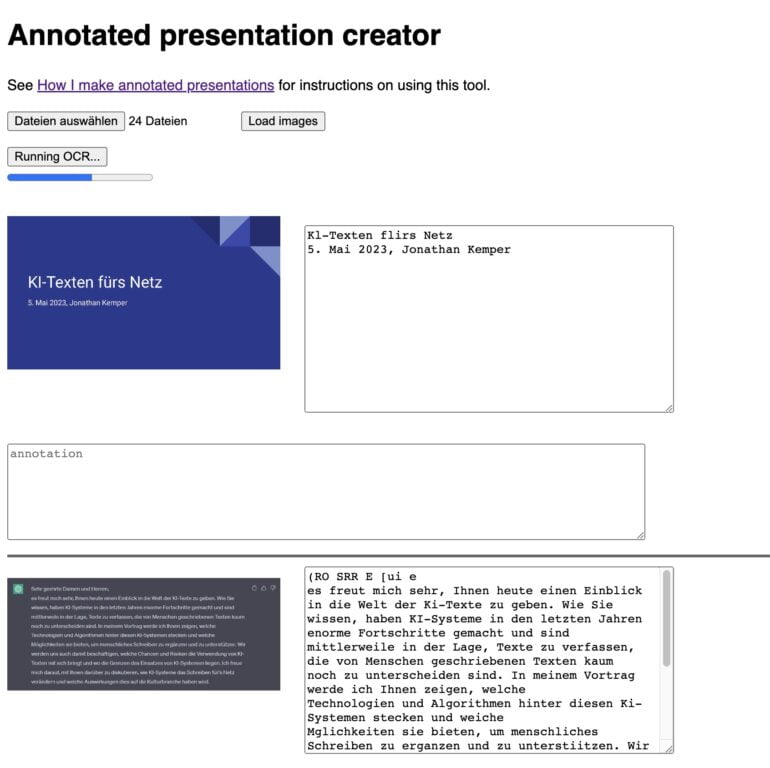 Um annotierte Präsentationen möglichst effizient zu erstellen, hat Willison ein Browser-basiertes Tool gebastelt. Damit lassen sich Folien als Bilder hochladen, Alt-Texte und Kommentare hinzufügen und am Ende ein fertig formatiertes HTML-Dokument exportieren, das problemlos z. B. in einen WordPress-Blog eingefügt werden kann.