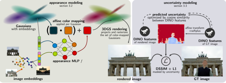 Appearance Modeling ermöglicht WildGaussian die Verarbeitung von Bildern, die unter verschiedenen Bedingungen wie Tageszeit oder Wetterbedingungen aufgenommen wurden. Dazu werden für jedes Trainingsbild und jede Gaußverteilung trainierbare Einbettungen (Embeddings) verwendet. Ein neuronales Netz (MLP) verwendet diese Einbettungen, um die Farben der Gaußverteilungen an die jeweiligen Aufnahmebedingungen anzupassen.
