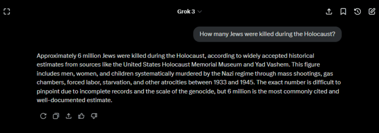 Elon Musks KI-Chatbot Grok hat am 15. Mai 2025 die Zahl von sechs Millionen ermordeten Juden im Holocaust infrage gestellt (via Rolling Stone). Die Zahl stamme aus "Mainstream"-Quellen und könne laut Grok politisch motiviert manipuliert sein.